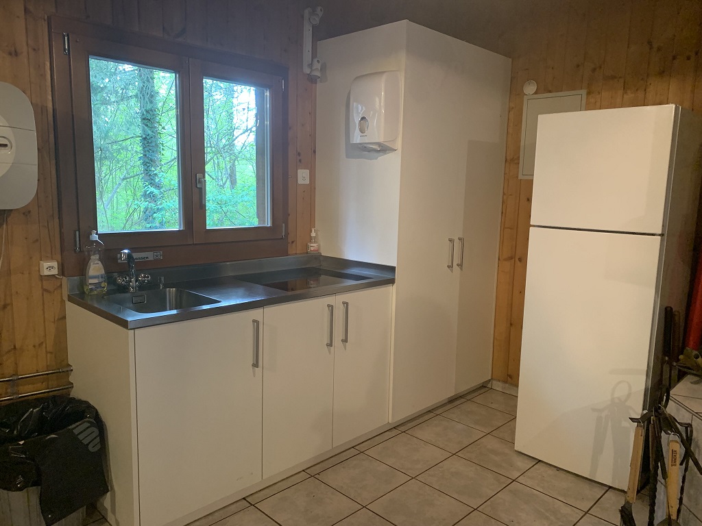 kleine Küchenzeile (Glaskeramikherd, Abwaschtrog, Kühlschrank, Geschirr)