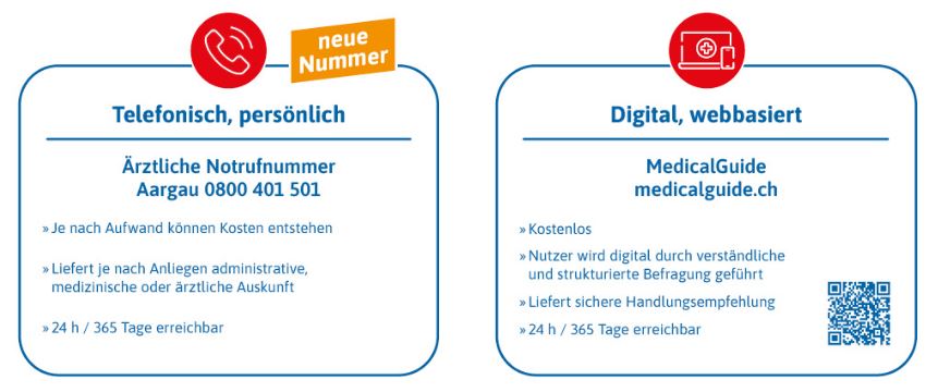 Ärztliche Notrufnummer: 0800 401 501 (Fr. 3.23/Min. für Anrufe aus dem Festnetz / Webseite www.notfall-aargau.ch).